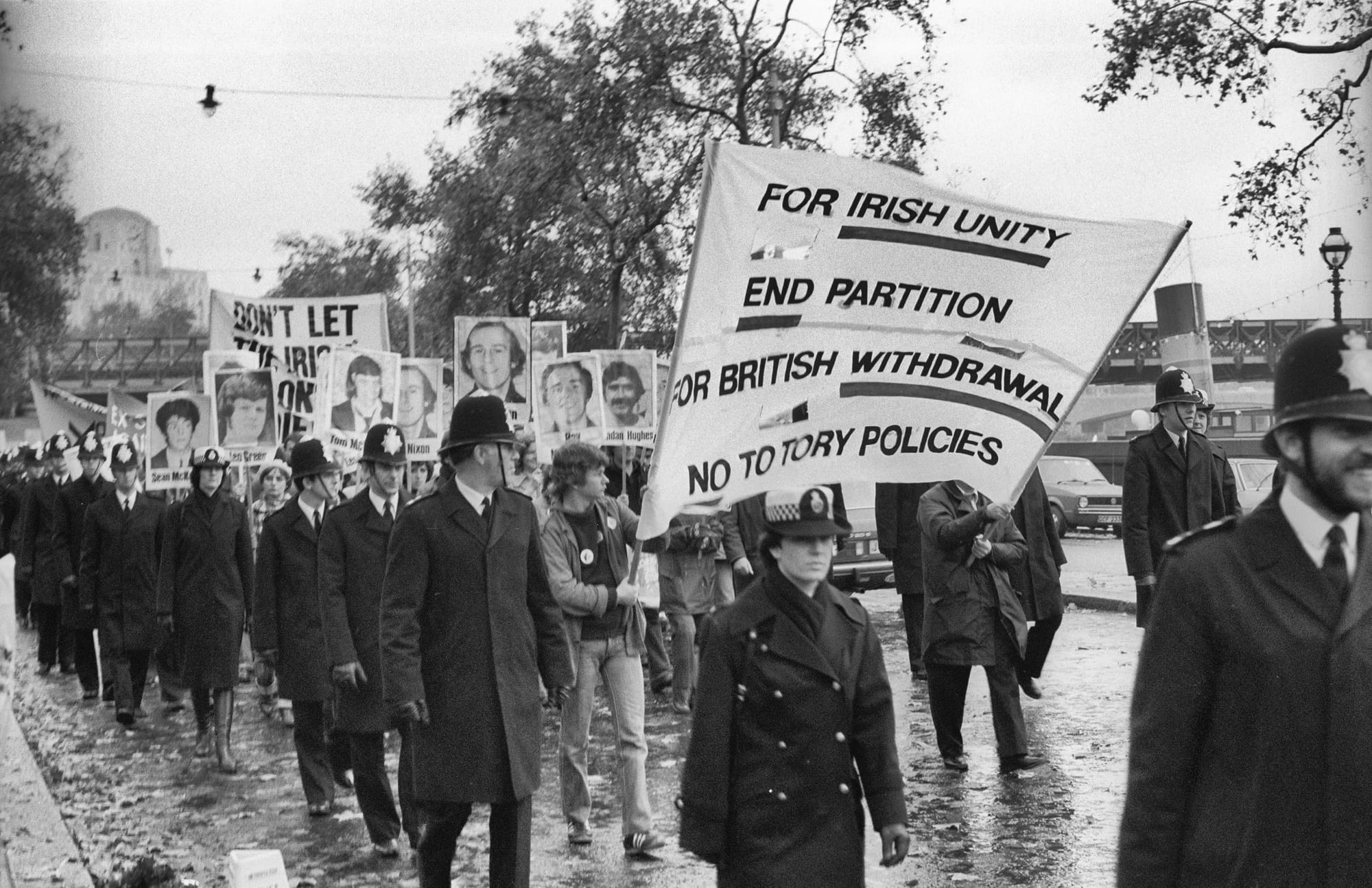From top left: train transferring refugees during the partition of India, 1947; For Irish Unity End Partition protest on the Thames Embankment, London, 1979; Refugee camp at Wau town, South Sudan 2016; A Myanmar Border Guard police officer with Kamein IDPs, 2012; Gazan girl looking for food, 2024.
