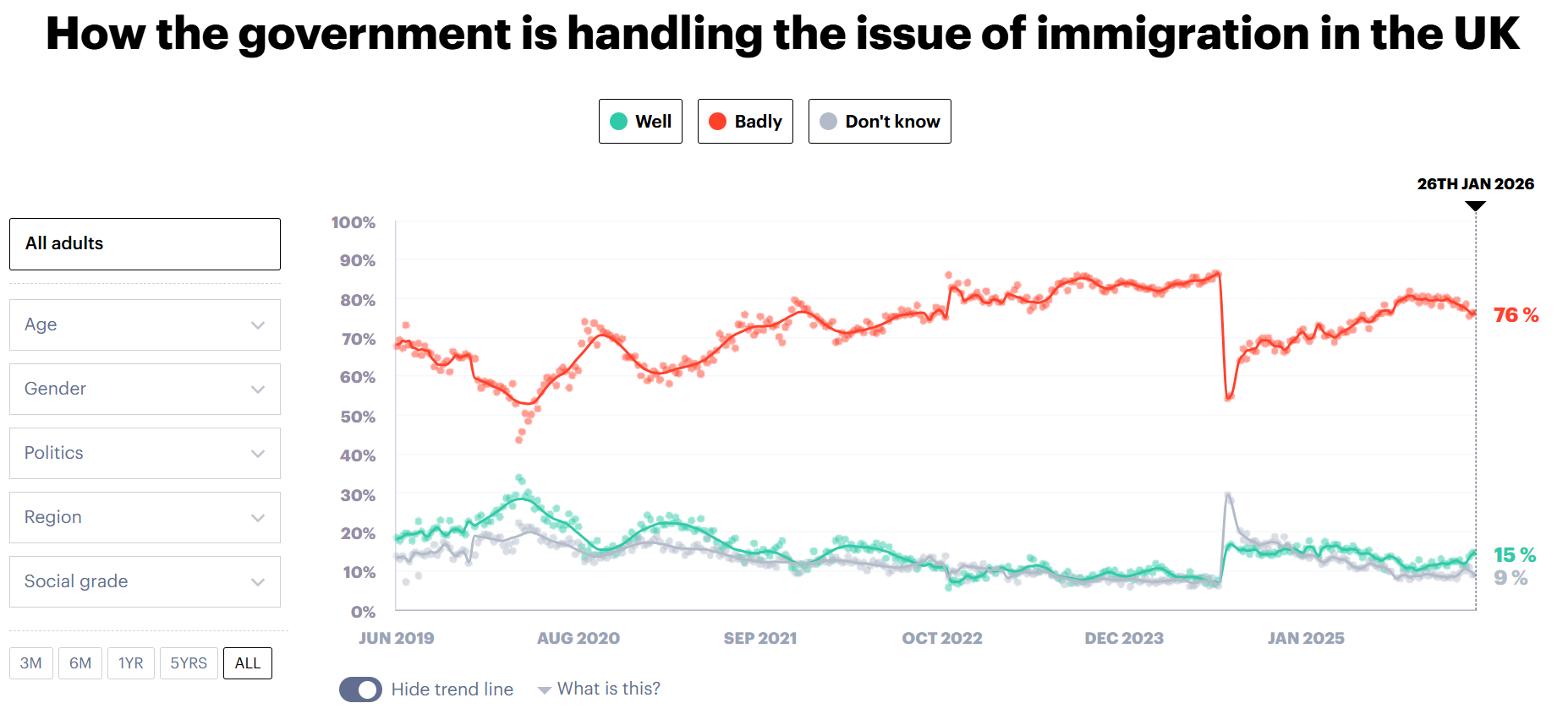 As of 26 January 2026, YouGov show that 76% of adults thought the Starmer government was handling immigration poorly. Clearly, considerable change is needed one way or the other if Labour intend to retain their majority when we next go to the polls.